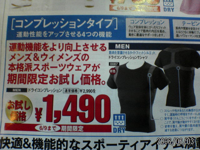 コンプレッションタイプが安いゾ! Tシャツ、スパッツ・・・1,490円だ。新製品・・・