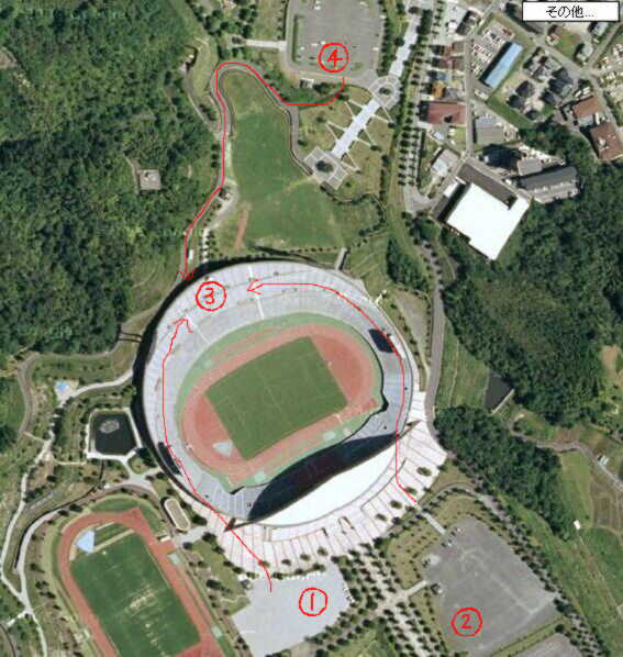雨天の場合、LOVERS練習は 広域公園ビーグアーチのバックスタンド入り口(画像の③)の