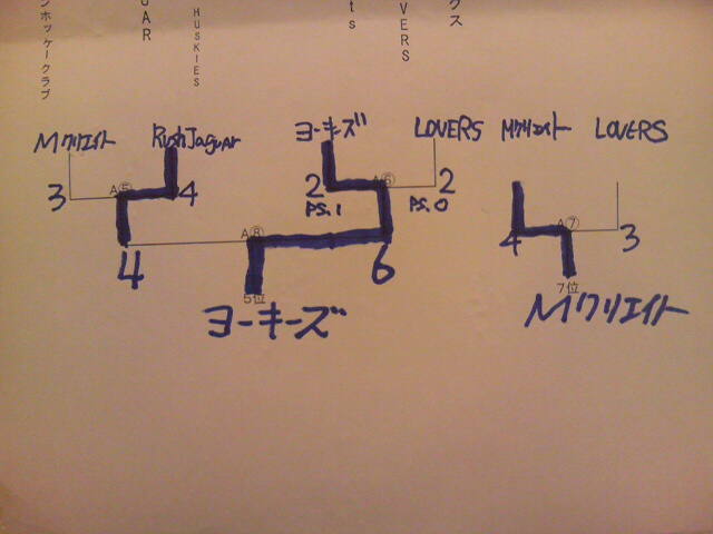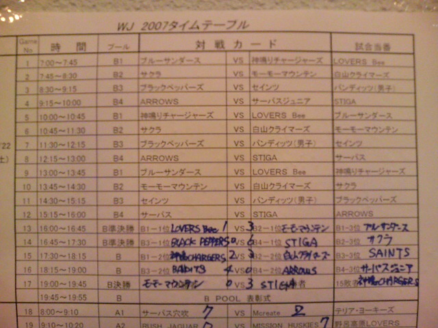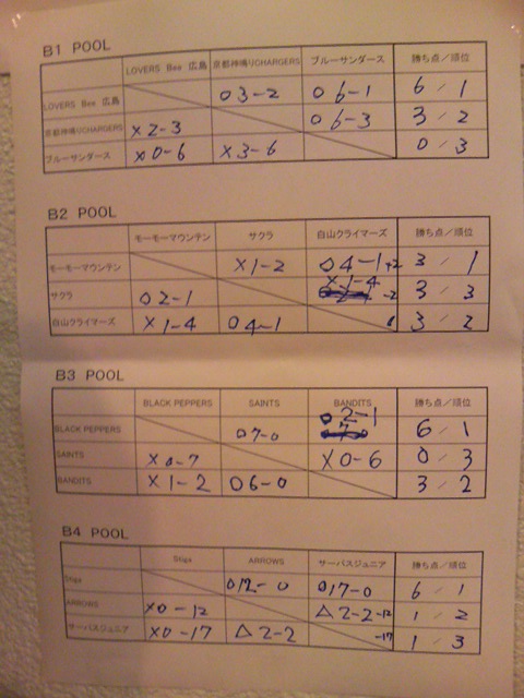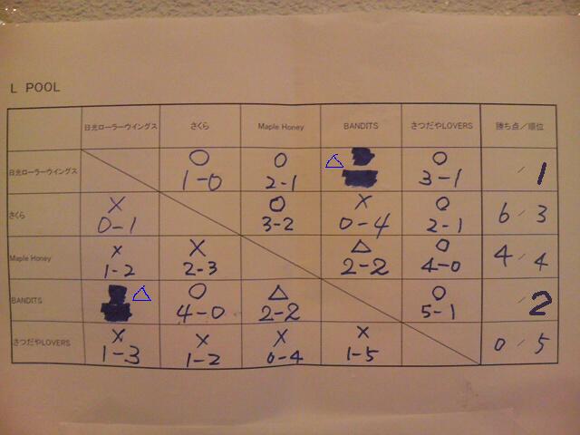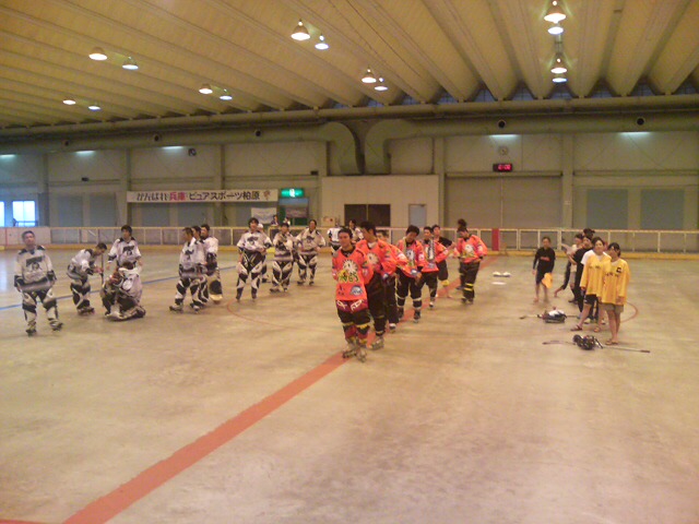 9/22~ 9/24 PSKで行われた West Japan Championship 2007 の結果速報 (非公式版)です。2007 HIHF INLINE HOCKEY WEST JAPAN CHAMPIONSHIP22-24 SEPTEMBER 2007さて・・・結果は・・・Aプール (8チーム) トーナメント +順位決定戦 正味8分×4Qまずは大会MVP 文句なし!MVP Daichi Suzuki @ HUSKEYS #54 つづいてチーム成績は、TEAM MISSION HUSKEYS が連覇 !! (皆さんWicked 1 が痛そうでしたけど・・・) 決勝の ローラーウィングス戦も 面白かったですが、準決勝の HUSKEYS v.s. サーパス穴吹 見ごたえ有りました。 1位 TEAM MISSION HUSKIES (兵庫) 2位 日光ローラーウイングス (栃木) 3位 サーパス穴吹インラインホッケークラブ (香川) 4位 Roller nuts (兵庫) 5位 テリア・ヨーキーズ (兵庫) 6位 RUSH JAGUAR (兵庫) 7位 Mcreate (愛知) 8位 はなぞの野呂高原LOVERS (広島)Bプール (12チーム) 予選リーグ と リーグ1位4チームによる決勝トーナメント + 2位同志による 順位戦 正味10分×2PB1ブロック LOVERS Bee 広島 (広島) 京都神鳴りCHARGERS (兵庫) ブルーサンダース (兵庫)B2ブロック モーモーマウンテン (三重) サクラ (和歌山) 白山クライマーズ (香川)B3ブロック BLACK PEPPERS (兵庫) SAINTS (兵庫) BANDITS(男子) (兵庫)B4ブロック Stiga (東京) ARROWS (兵庫) サーパスジュニア (香川) Lプール (5チーム) 5チームによる総当たり 正味10分×2P 1位 日光ローラーウイングスレディース (栃木) 2位 BANDITS(女子) (兵庫) 3位 さくら (和歌山) 4位 Maple Honey (兵庫) 5位 さつだや LOVERS (広島)--------------------------------------------------------大会要綱詳細 LOVERSバージョンは下記に有ります。大会要綱 http://hihl.ath.cx/WJ2007/WJ2007-1.pdfタイムテーブル http://hihl.ath.cx/WJ2007/WJ2007-TT.pdf