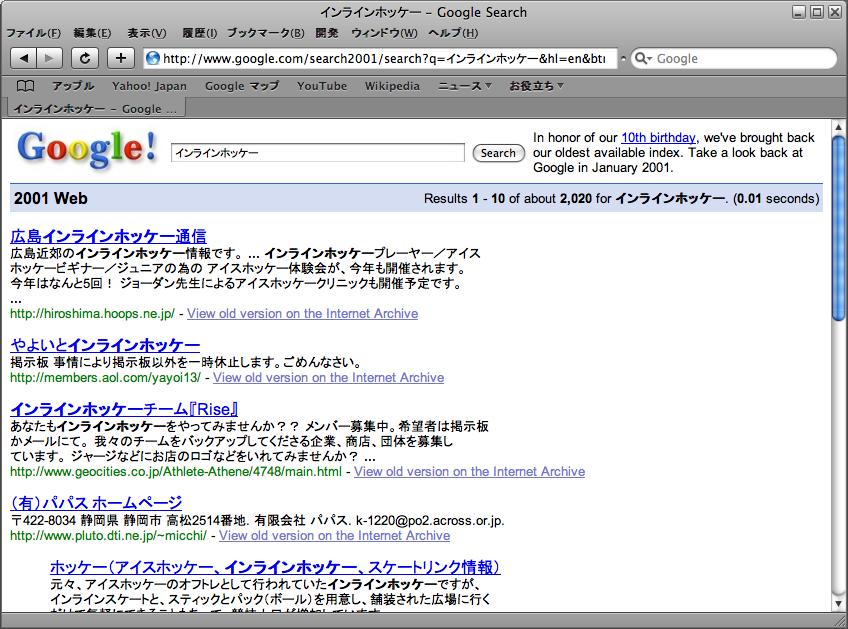 Googleが10周年記念事業の1つとして、2001年当時の検索インデックスを再リリースした(10周年なら、1998年版だろ・・・と思うんですが、『さまざまな技術的理由』によりダメらしいです)