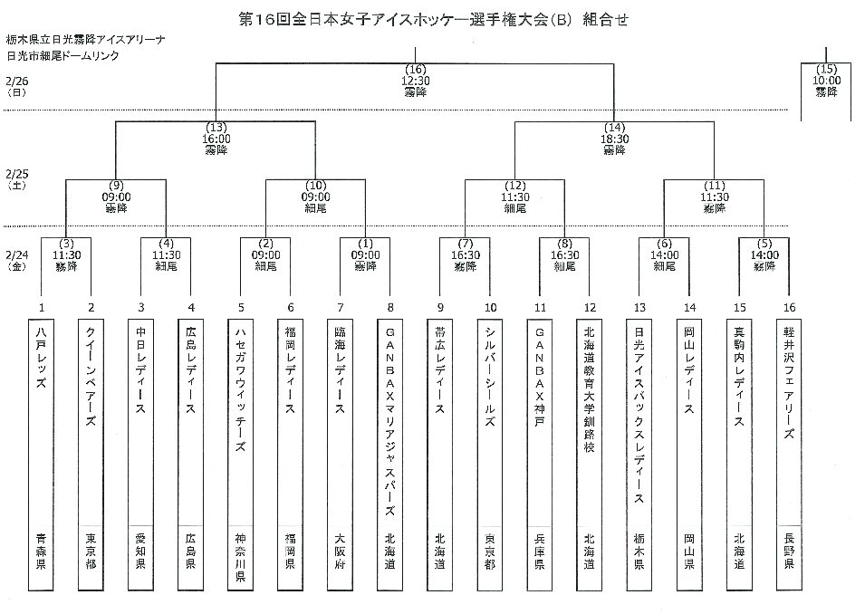 第16回全日本女子アイスホッケー選手権大会(B)の対戦組合せとスケジュールが発表になっています