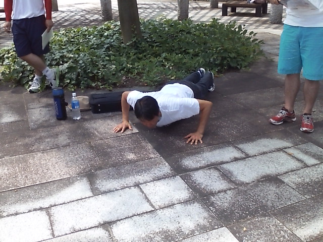 腕立ての見本を見せる八木強化委員長 『ここまで落してください』