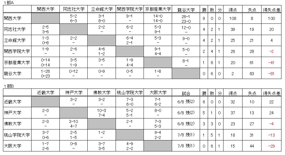 1部-Aは、関大圧勝、得点は100点を越えました。得失点差