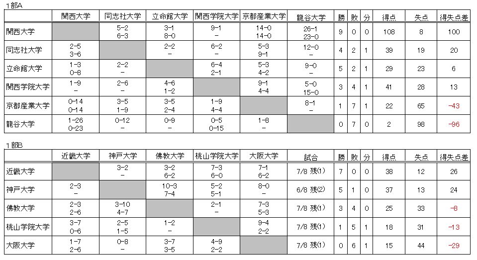 立命館大学と同志社大学による、2位争いは、得失点差で抜きつ抜かれつ・・・ますます白熱しています。