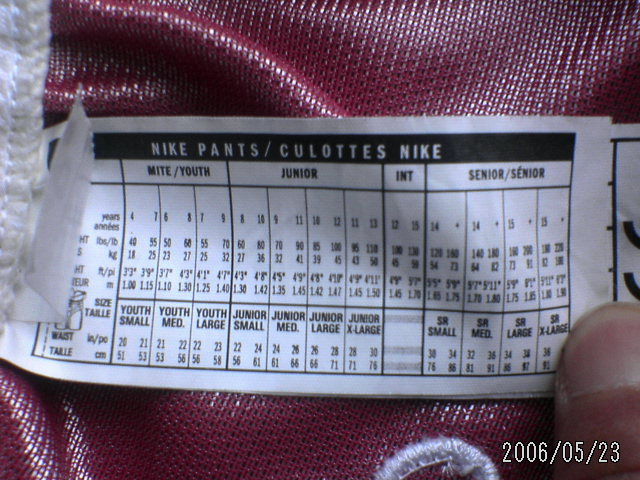 NIKEのロンパン、こんなタグ付いています。サイジングチャートです。