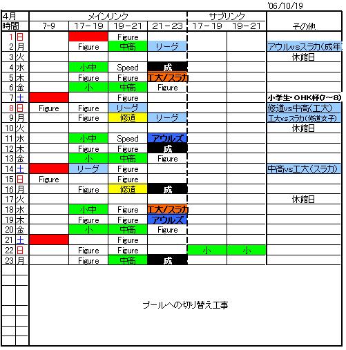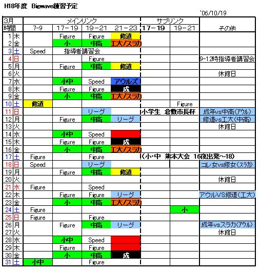 ビッグウェーブ(BW)の 3月4月の各チームの練習割当て予定表入手しました。