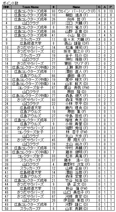 広島コレクターズ成年 8 - 2 スラッカーズF [第⑫試合] 個人成績(ポイント順) 詳細 http://hihl.ath.cx/net/HIHF/HIHL92XX.aspx?sort=p&stage=20160200