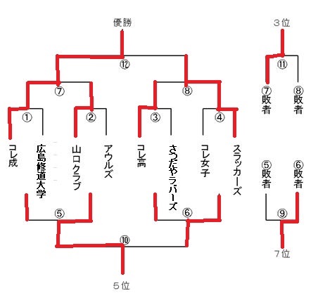 優勝 コレクターズ成年 2位 スラッカーズF 3位 山口クラブ 4位 コレクターズ中高 5位 アウルズ 6位 コレクターズ女子 7位 さつだやラバーズ 8位 広島修道大学 対戦成績 広島コレクターズ成年 15 - 1 広島修道大学 [第①試合]